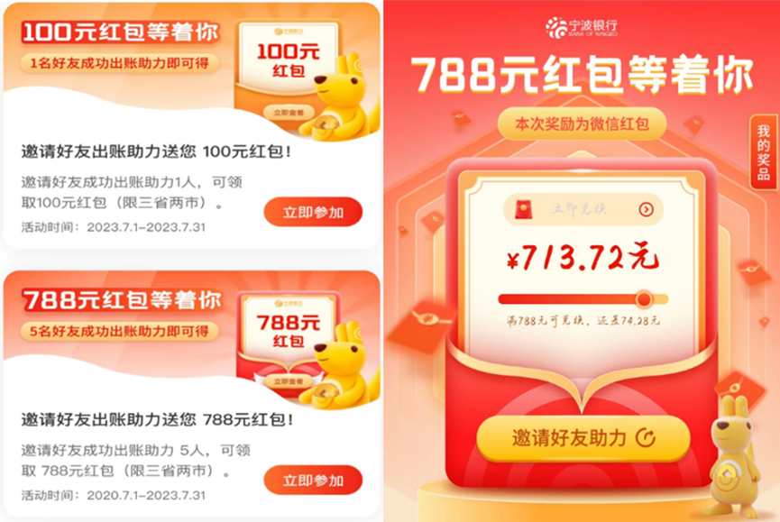据宁波银行宁来花官方小程序,截至查询日2023年7月26日,宁波银行仍有两项“分享领红包现金”活动。