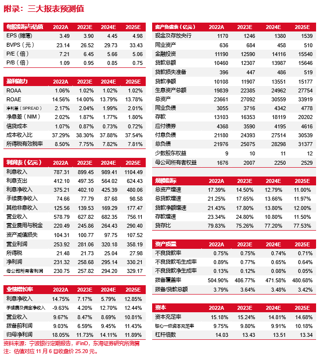 盈利预测与投资建议:我们维持原预测,预计2023-2025年营业收入分别为627.82、682.35与756.11亿元,归母净利润分别为257.82、294.20与329.17亿元。行业层面,融资平台与房地产等重点领域风险化解持续推进、宏观经济处于底部,银行业经营压力有望缓解;公司层面,宁波银行专业经营能力突出,相对优势明显,当前公司相对估值位于低位。基于以上,维持公司“买入”投资评级。