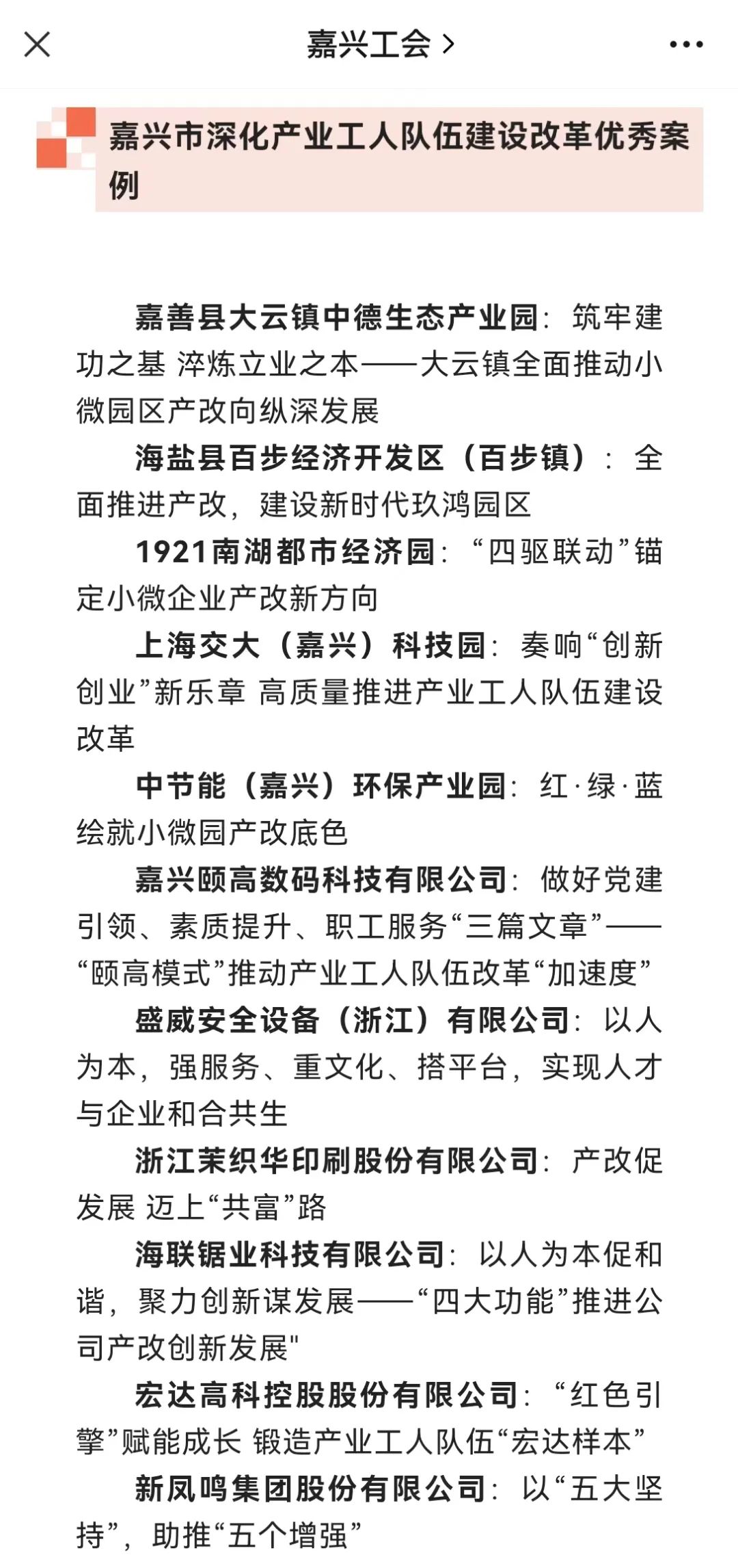 近日,嘉兴市产改协调小组办公室公布《嘉兴市深化产业工人队伍建设改革优秀案例》,宏达高科控股股份有限公司主题为《“红色引擎”赋能成长锻造产业工人队伍“宏达样本”》的案例榜上有名。