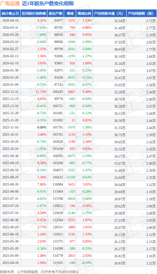 近日广电运通披露,截至2026年4月10日公司股东户数为9.11万户,较3月31日增加1372.0户,增幅为1.53%。户均持股数量由上期的2.77万股减少至2.73万股,户均持股市值为32.34万元。
