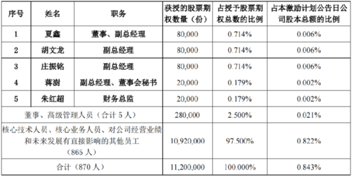 草案显示,本次激励计划采用授予期权作为激励方式,激励对象为公司(含分公司、全资子公司、控股子公司、参股子公司等)的董事(不包括独立董事)、高级管理人员、核心技术人员、核心业务人员、对公司经营业绩和未来发展有直接影响的其他员工。激励对象总人数不超过870人,其中董事(不包括独立董事)、高级管理人员5人。拟授予的股票期权数量为1120万份,占本激励计划公告日公司股本总额13.29亿股的0.84%。本激励计划的行权价格为17.85元/份,有效期为自股票期权授予登记完成之日起至所有股票期权全部行权或注销之日止,最长不超过48个月。