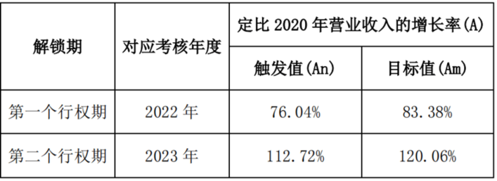 本激励计划授予的股票期权行权考核年度为2022至2023年两个会计年度,每个会计年度考核一次,以2020年营业收入为业绩基数,对各考核年度的营业收入定比2020年营业收入基数的增长率(A)进行考核,业绩考核目标如下: