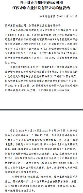 深交所公司部监管函〔2022〕第141号、第142号分别开给了正邦科技、公司控股股东及实控人。