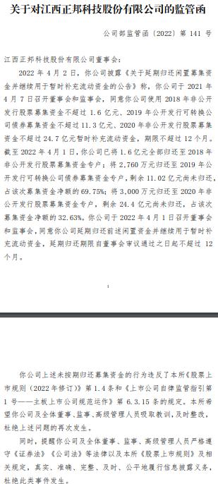 另外,正邦科技6月21日收到深交所监管函,公司未按期归还募集资金的行为违反了深交所《股票上市规则(2022年修订)》第1.4条和《上市公司自律监管指引第1号——主板上市公司规范运作》第6.3.15条的规定。