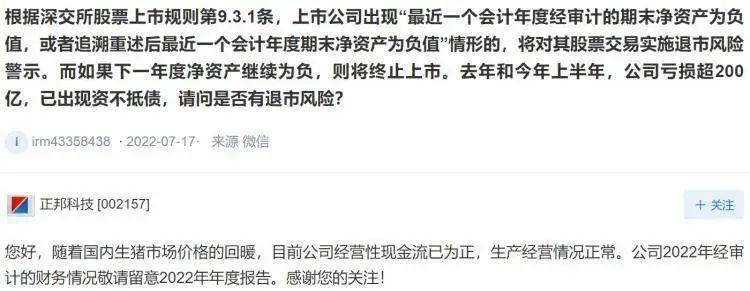 公司回复称,随着国内生猪市场价格的回暖,目前公司经营性现金流已为正,生产经营情况正常。