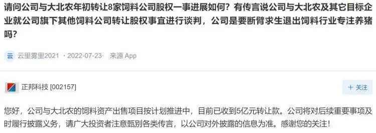 公司回复称,公司与大北农的饲料资产出售项目按计划推进中,目前已收到5亿元转让款。公司将对后续重要事项及时履行披露义务,请广大投资者注意甄别各类传言,以公司对外披露的信息为准。