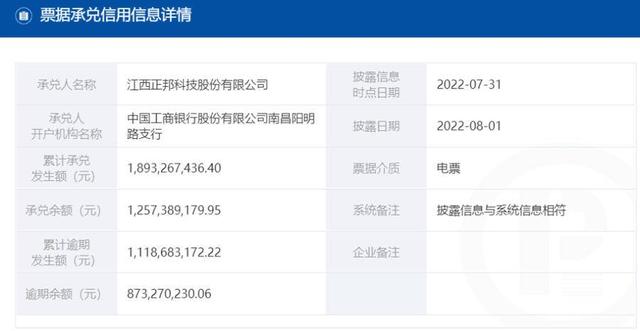 票据信息披露平台显示,江西正邦科技股份有限公司累计承兑发生额1,893,267,436.40元,承兑余额1,257,389,179.95元,累计逾期发生额1,118,683,172.22元,承兑人开户机构名称为中国工商银行股份有限公司南昌阳明路支行。