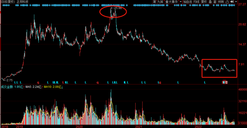 从上图不难发现,正邦科技自2020年9月2日以后,该公司股价快速下跌通道;另外,该公司股价自2022年3月15日后,走出横盘震荡下跌的走势,并在5月10日创下历史最低价5.21元/股。