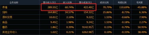 据了解,正邦科技2021年归母净利润亏损188.19亿。一方面,由于该公司费用增加;另一方面,由于该公司养殖业务大幅亏损所致,养殖板块营业收入与营业成本倒挂。其中,生猪养殖业务实现营业收入289.55亿,占总收入比例为60.74%,营业收入成本为422.4亿,占总成本的70.79%,毛利率为-45.88%。
