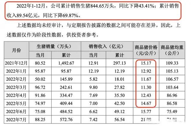 在猪价大幅下滑的2022年12月,正邦科技销售均价也环比出现大幅下降。12月份的商品猪(扣除仔猪后)销售均价18.86元/公斤,较上月下降17.82%。