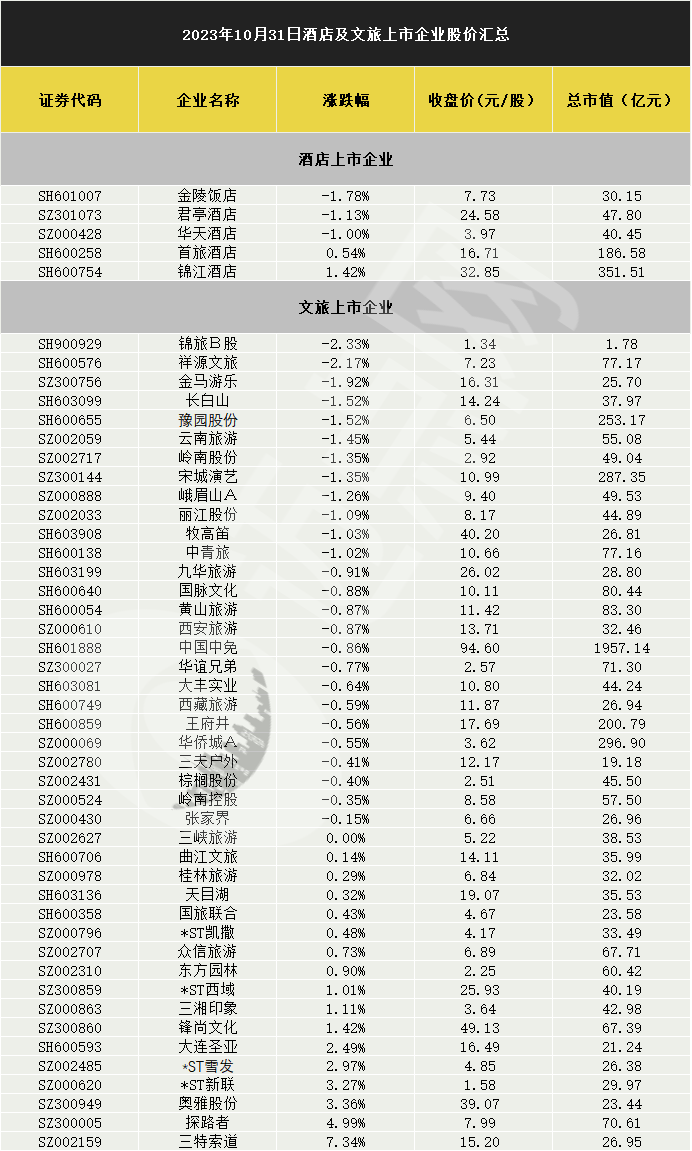 酒店个股方面,金陵饭店(SH:601007)收跌1.78%,报收7.73元/股;君亭酒店(SZ:301073)收跌1.13%,报收24.58元/股;华天酒店(SZ:000428)收跌1.00%,报收3.97元/股。