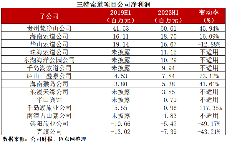 其次,三特索道旗下项目经过多年的培育,终于迎来了“收获期”。结合2023年中报来看,庐山三叠泉、贵州梵净山、海南猴岛公园、海南索道项目公司净利润较2019年同期分别取得了73.12%、45.94%、41.61%和16.09%的增长。