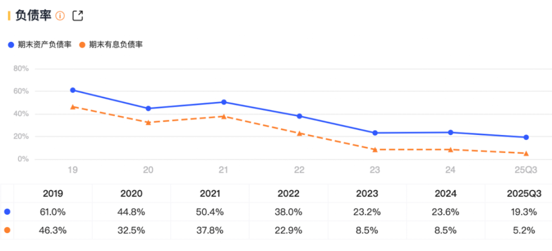 截至2025年三季度末,公司资产负债率降至19.3%,较2021年高位50.4%大幅改善,财务结构显著优化。