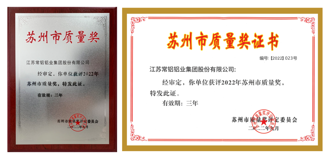 今年,常铝股份荣获2022年度苏州市质量奖。苏州市质量奖是由苏州市政府设立的质量管理领域的辉煌荣誉,授予在全面质量管理和追求卓越绩效上取得显著成就的苏州企业和组织。