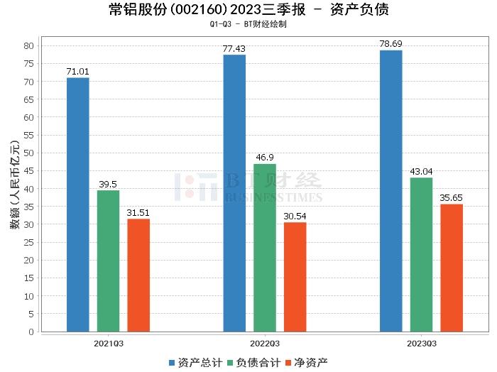 在资产负债方面,2023年三季度,常铝股份的总资产为78.69亿元,相比上年度末的83.71亿元有所下降。负债合计为43.04亿元,较上年度末的47.81亿元也有所减少。公司的净资产为35.65亿元,略低于上年度末的35.89亿元。资产负债率为54.7%,相比上年度末的57.12%有所下降。这些变化主要是由于公司补充流动资金的募集资金归还到期债务,以及银团长期借款增加所致。
