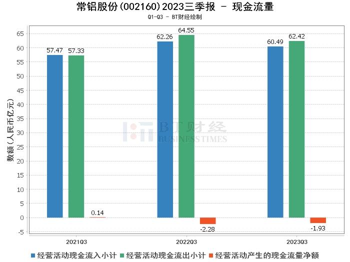 在现金流量方面,公司2023年三季度经营活动产生的现金流量净额为-1.93亿元,较上年同期有所改善。经营活动现金流入小计为60.49亿元,略低于上年同期的62.26亿元。经营活动现金流出小计为62.42亿元,较上年同期的64.55亿元有所减少。