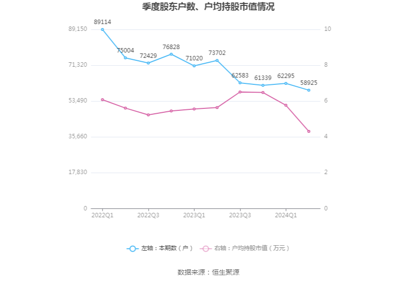 筹码集中度方面,截至2024年上半年末,公司股东总户数为5.89万户,较一季度末下降了3370户,降幅5.41%;户均持股市值由一季度末的5.77万元下降至4.31万元,降幅为25.30%。