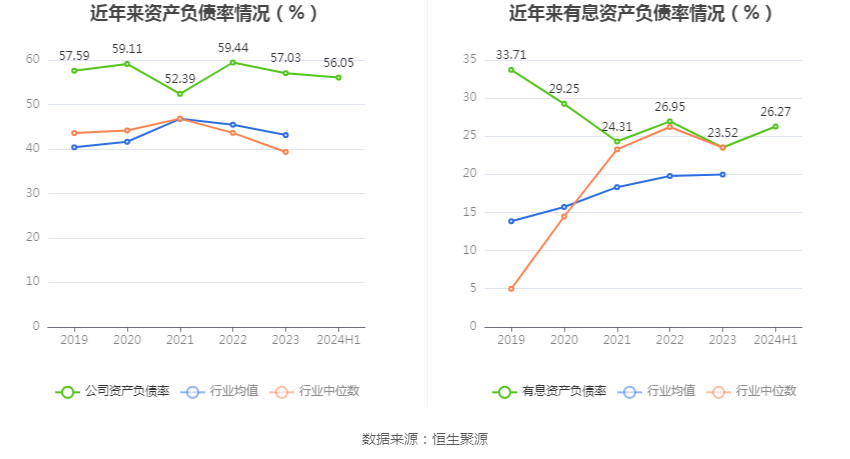 在偿债能力方面,公司2024年上半年末资产负债率为56.05%,相比上年末下降0.98个百分点;有息资产负债率为26.27%,相比上年末上升2.75个百分点。
