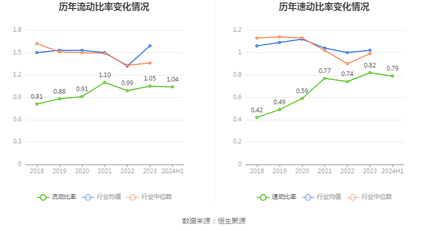 2024年上半年,公司流动比率为1.04,速动比率为0.79。