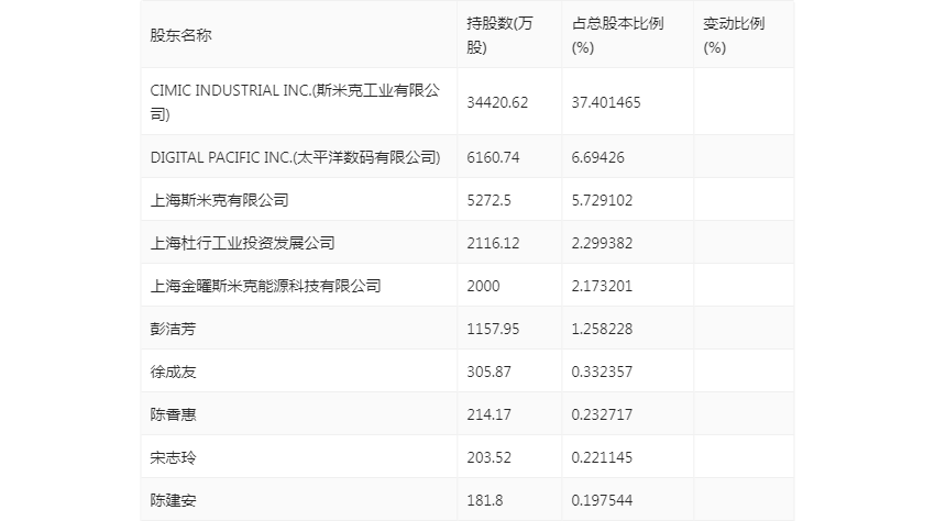 半年报显示,2024年上半年末的公司十大流通股东中,新进股东为宋志玲、陈建安,取代了一季度末的钟鸣、邹海斌。在具体持股比例上,CIMIC INDUSTRIAL INC.(斯米克工业有限公司)、DIGITAL PACIFIC INC.(太平洋数码有限公司)、上海斯米克有限公司、上海杜行工业投资发展公司、上海金曜斯米克能源科技有限公司、彭洁芳、徐成友、陈香惠持股有所上升。