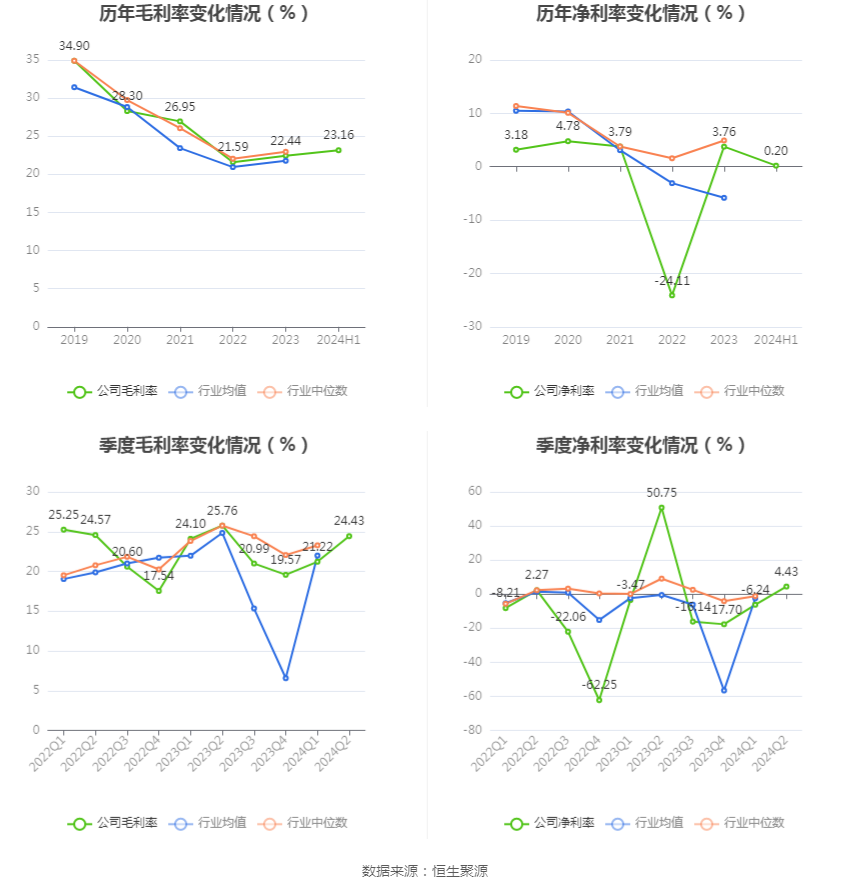 2024年上半年,公司毛利率为23.16%,同比下降1.95个百分点;净利率为0.20%,较上年同期下降29.42个百分点。从单季度指标来看,2024年第二季度公司毛利率为24.43%,同比下降1.33个百分点,环比上升3.21个百分点;净利率为4.43%,较上年同期下降46.32个百分点,较上一季度上升10.67个百分点。