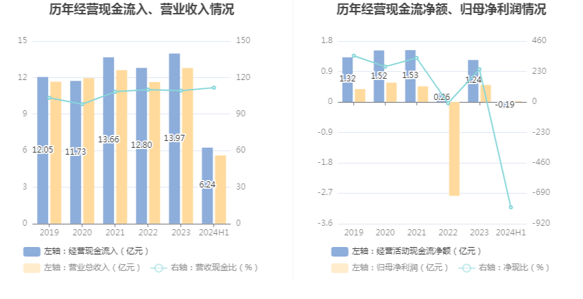 2024年上半年,公司营业收入现金比为111.70%,净现比为-796.58%。