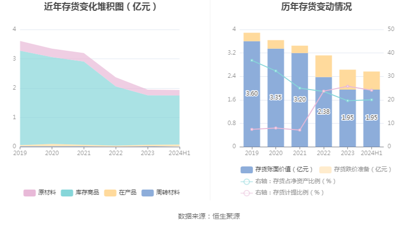 从存货变动来看,截至2024年上半年末,公司存货账面价值为1.95亿元,占净资产的20.05%,较上年末减少45.32万元。其中,存货跌价准备为6192.62万元,计提比例为24.14%。