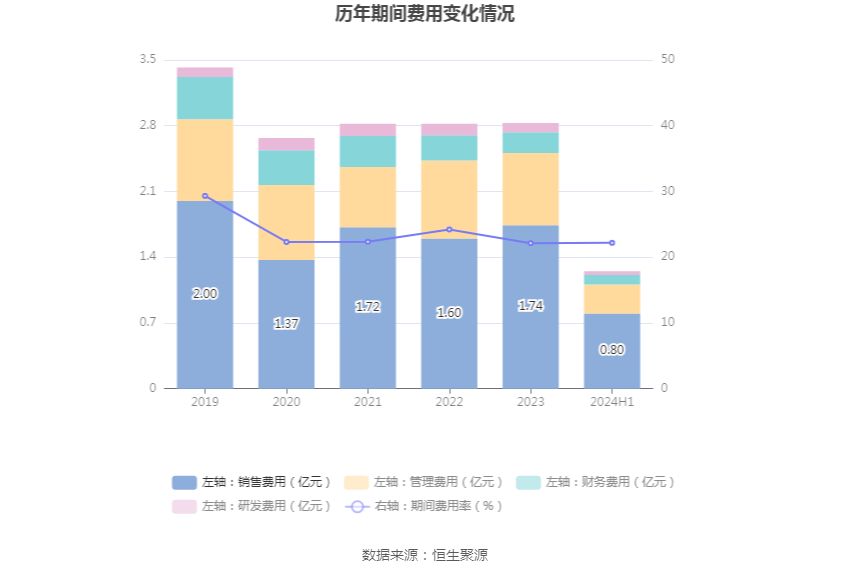 2024年上半年,公司期间费用为1.24亿元,较上年同期减少601.68万元;期间费用率为22.19%,较上年同期下降0.72个百分点。其中,销售费用同比下降0.39%,管理费用同比下降7.19%,研发费用同比下降13.66%,财务费用同比下降21.88%。