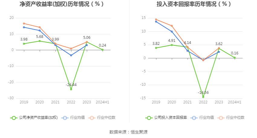 盈利能力方面, 2024年半年度公司加权平均净资产收益率为0.24%,同比下降15.22个百分点。公司2024年上半年投入资本回报率为0.16%,较上年同期下降10.06个百分点。