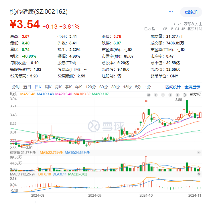 11月5日,截至收盘,悦心健康(002162.SZ)股价涨3.81%,报3.54元/股,总市值为32.58亿元。