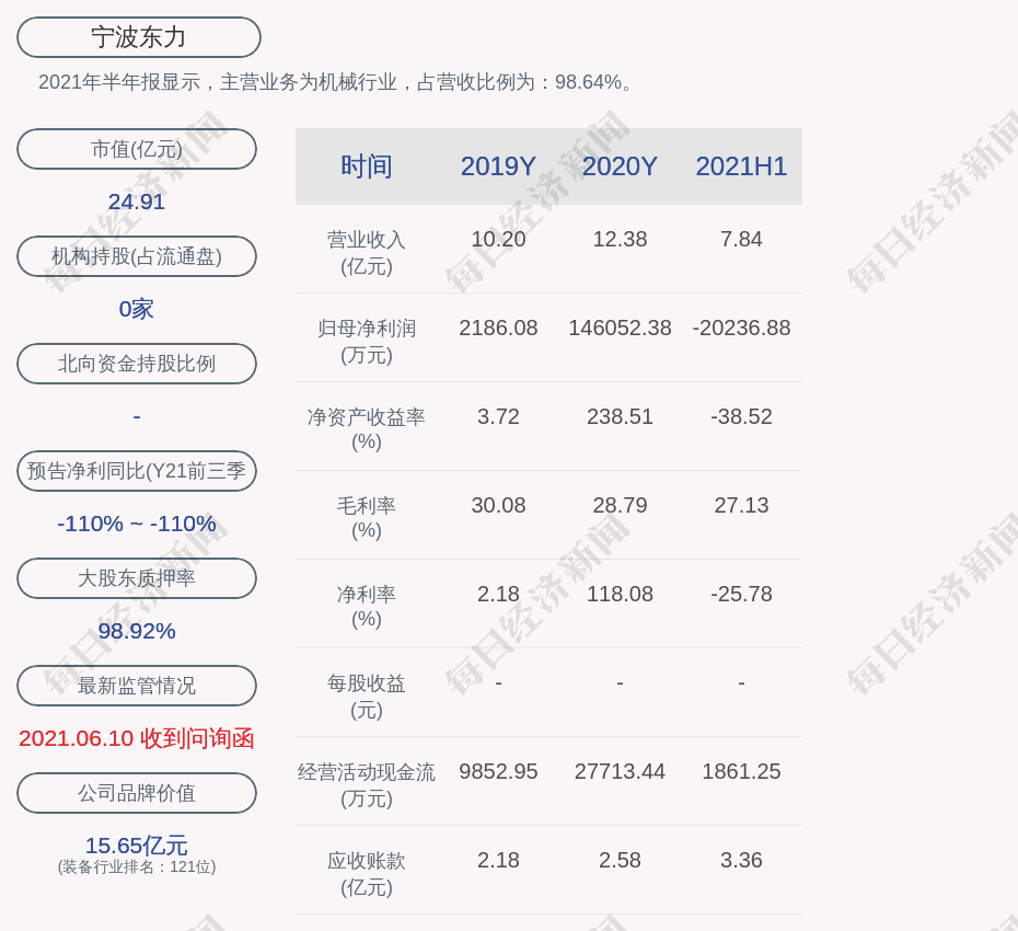 2021年半年报显示,宁波东力的主营业务为机械行业,占营收比例为:98.64%。