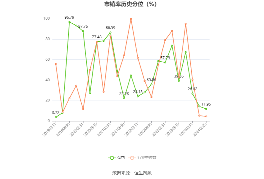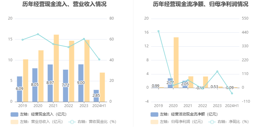 2024年上半年,公司营业收入现金比为40.72%,净现比为-43.91%。