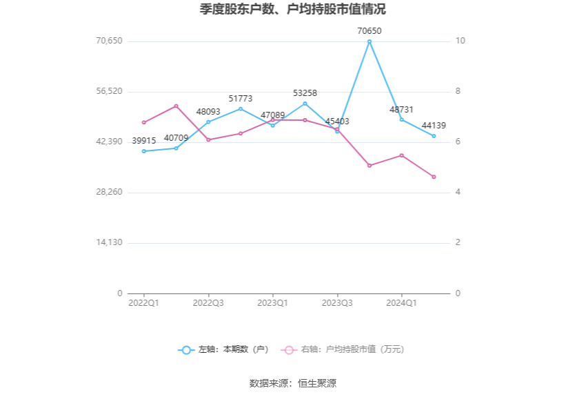 筹码集中度方面,截至2024年上半年末,公司股东总户数为4.41万户,较一季度末下降了4592户,降幅9.42%;户均持股市值由一季度末的5.48万元下降至4.63万元,降幅为15.51%。