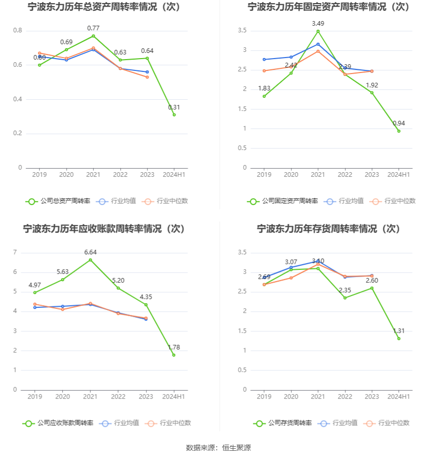 营运能力方面,2024年上半年,公司公司总资产周转率为0.31次,上年同期为0.31次(2023年上半年行业平均值为0.27次,公司位居同行业29/79);固定资产周转率为0.94次,上年同期为0.92次(2023年上半年行业平均值为1.20次,公司位居同行业54/79);公司应收账款周转率、存货周转率分别为1.78次、1.31次。