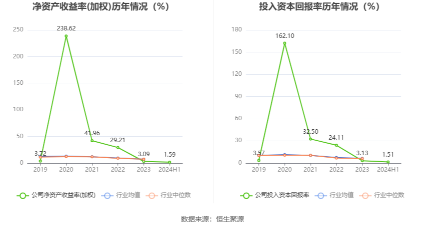 盈利能力方面, 2024年半年度公司加权平均净资产收益率为1.59%,同比持平。公司2024年上半年投入资本回报率为1.51%,较上年同期下降0.27个百分点。