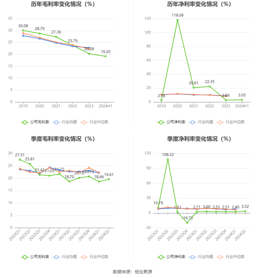 2024年上半年,公司毛利率为19.20%,同比下降0.88个百分点;净利率为3.03%,较上年同期上升0.16个百分点。从单季度指标来看,2024年第二季度公司毛利率为19.61%,同比上升0.91个百分点,环比上升0.95个百分点;净利率为3.52%,较上年同期上升0.52个百分点,较上一季度上升1.12个百分点。
