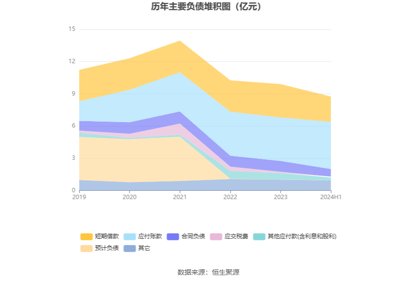负债重大变化方面,截至2024年上半年末,公司短期借款较上年末减少24.14%,占公司总资产比重下降2.80个百分点;应付账款较上年末增加8.35%,占公司总资产比重上升2.25个百分点;合同负债较上年末减少30.83%,占公司总资产比重下降1.22个百分点;其他应付款(含利息和股利)较上年末减少49.69%,占公司总资产比重下降1.20个百分点。
