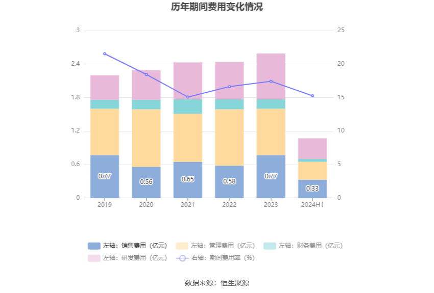 2024年上半年,公司期间费用为1.07亿元,较上年同期减少1250.76万元;期间费用率为15.27%,较上年同期下降1.29个百分点。其中,销售费用同比下降0.58%,管理费用同比下降24.1%,研发费用同比增长3.63%,财务费用同比下降39.7%。