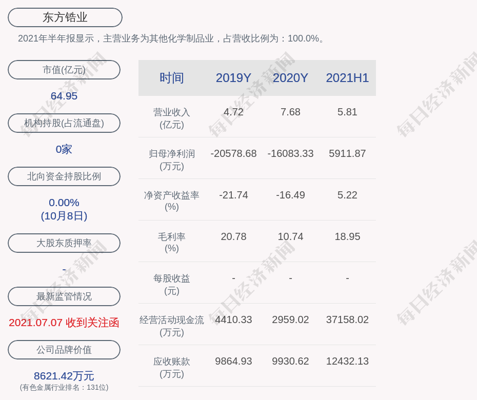 2021年半年报显示,东方锆业的主营业务为其他化学制品业,占营收比例为:100.0%。
