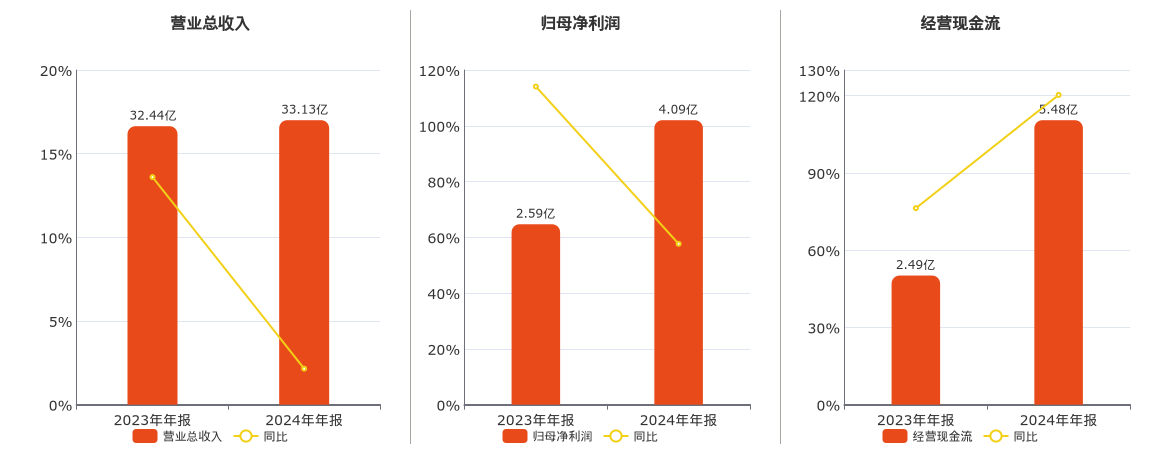 公司营业总收入为33.13亿元。归母净利润为4.09亿元。经营活动现金净流入为5.48亿元。