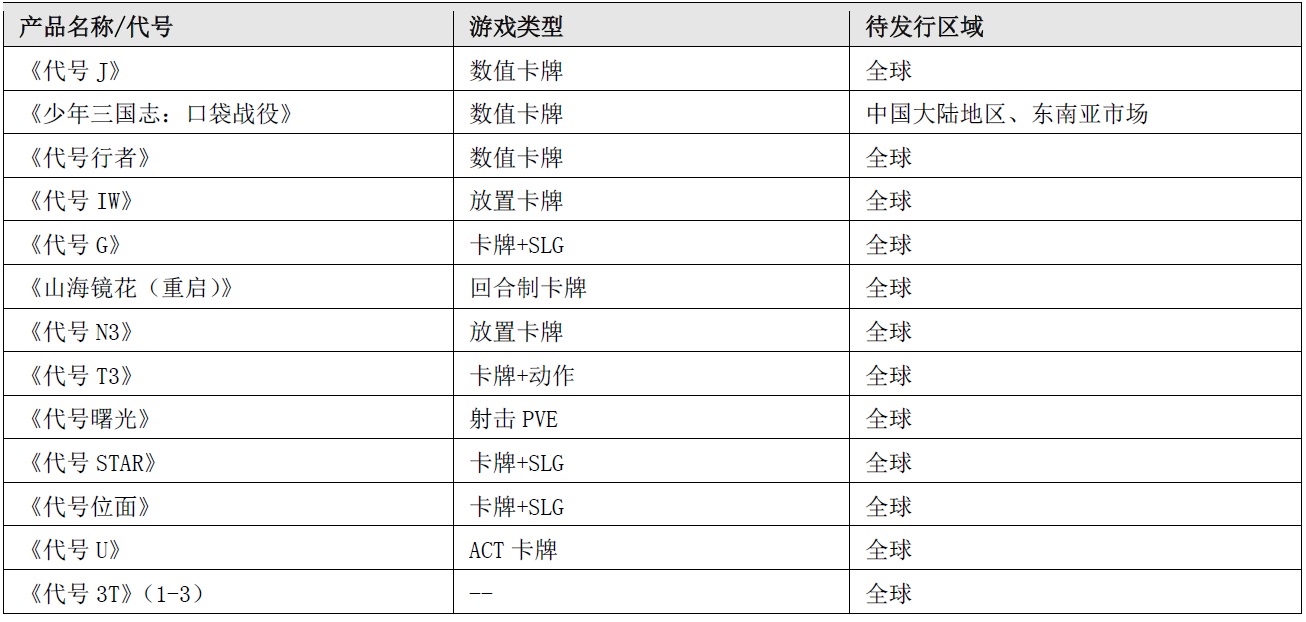 目前,基于持续的研发投入与研发架构升级,公司储备了一系列符合“全球化卡牌+”战略的游戏,其中4款自研产品针对全球不同区域已有年内上线计划,分别是《代号:J》《战火与永恒》《代号:IW》《新盗墓笔记》。正版IP授权MMO手游《新盗墓笔记》通过本地化调优计划在中国港台地区上线并出海欧美及东南亚市场;少年工作室首款全球题材卡牌手游《代号:J》预计将在日本及东南亚上线,该产品是一款近未来幻想色彩的二次元数值卡牌游戏;公司自研SLG手游《战火与永恒》已获得游戏版号,该游戏在欧美上线后表现良好,计划年内在中国大陆推出;创新放置卡牌《代号:IW》预计将在欧美及东南亚上线。
