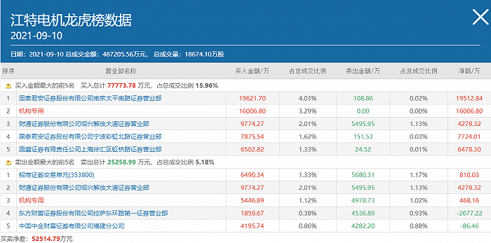 9月10日,除了作手新一、章盟主等知名游资以外,还有部分机构资金也继续看好江特电机。其中,一个机构专用席位居于该股龙虎榜买方第二位,买入金额为1.6亿元。另有一个机构专用席位买入该股5446.89万元,同时卖出4978.73万元。