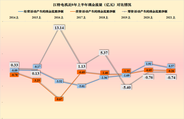 从现金流量来看,江特电机在2016年和2019年上半年进行过比较大的投资活动,其他时间整体保持相对平静的状态,近三个上半年总体算平稳经营,没有见到有大的资金动作。