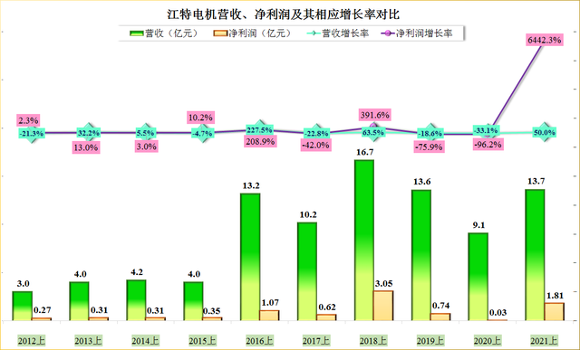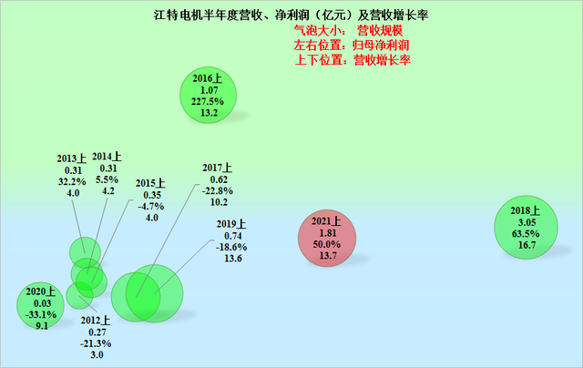 当然得看气泡图,江特电机,2021年上半年以一个较大的气泡大小占据着中间偏下的位置,也就是说从营收规模上江特电机并非最高,低于2018年同期,而增长率和净利润也仅为中等偏上的水平。注意这里真有去年基数低的问题,2020年同期江特电机的营收还下降了33%,相比2019年上半年,江特电机的营收只增长了1000万元。