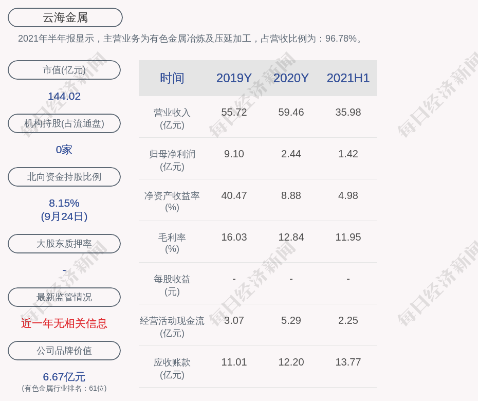 2021年半年报显示,云海金属的主营业务为有色金属冶炼及压延加工,占营收比例为:96.78%。