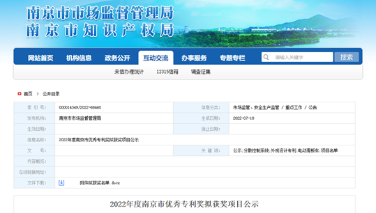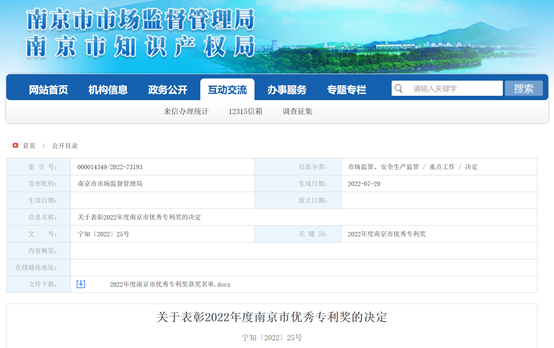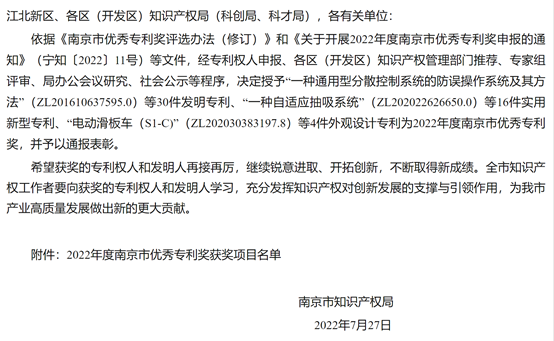 2022年度南京市优秀专利奖由南京市知识产权局牵头评选,共计评选出发明专利优秀奖30项,实用新型优秀专利奖16项,外观设计优秀专利奖3项。