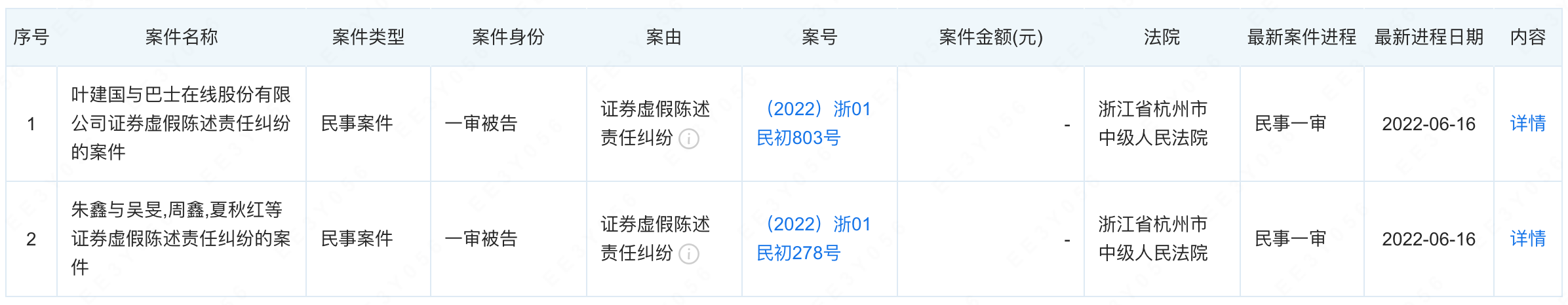 信息显示,今年6月16日,叶建国与巴士在线证券虚假陈述责任纠纷案件,朱鑫与巴士在线时任董事、副总经理吴旻(兼任巴士科技副总裁)吴旻,董事长周鑫、时任副总经理夏秋红等证券虚假陈述责任纠纷的案件,提请杭州市中级人民法院民事一审开庭,目前相关判决结果还未披露。