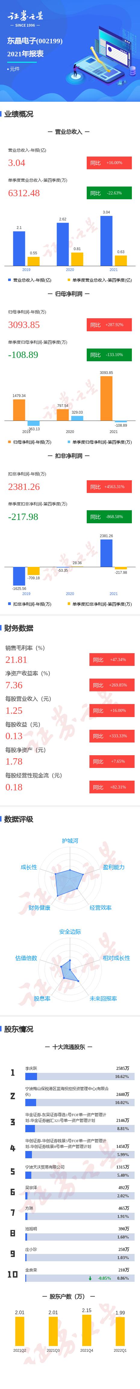东晶电子2021年报显示,公司主营收入3.04亿元,同比上升16.0%;归母净利润3093.85万元,同比上升287.92%;扣非净利润2381.27万元,同比上升4563.31%;其中2021年第四季度,公司单季度主营收入6312.48万元,同比下降22.63%;单季度归母净利润-108.9万元,同比下降133.1%;单季度扣非净利润-217.99万元,同比下降868.58%;负债率34.89%,投资收益96.79万元,财务费用-187.9万元,毛利率21.81%。