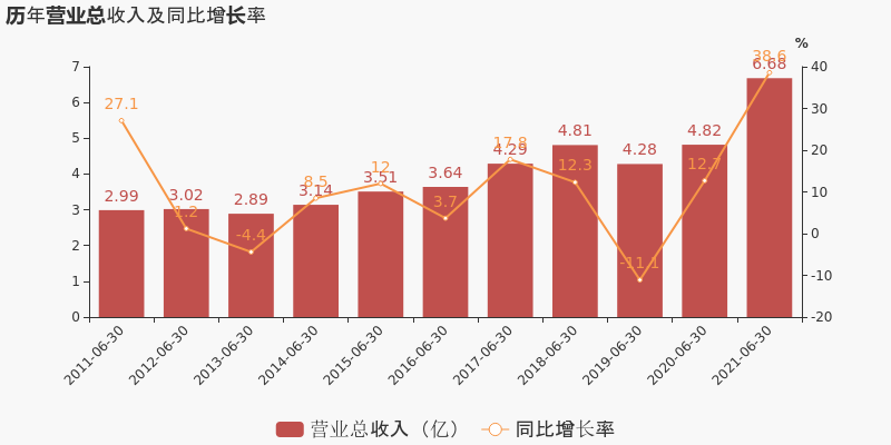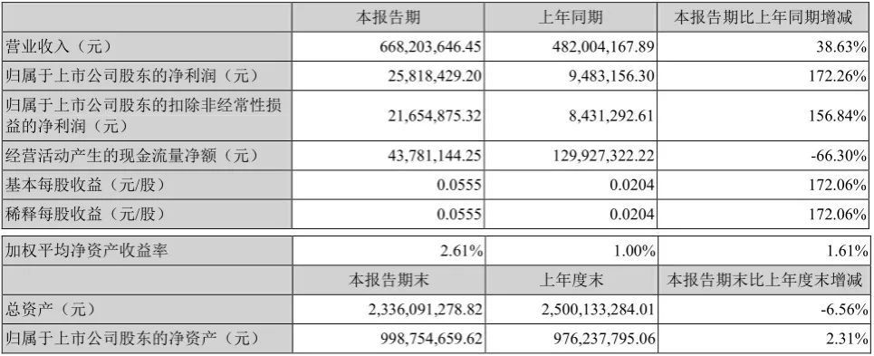九鼎新材于2021年8月28日披露中报,公司2021上半年实现营业总收入6.7亿,同比增长38.6%;实现归母净利润2581.8万,同比增长172.3%;每股收益为0.06元。