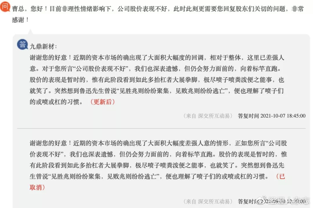 然而,就在9月30日,有投资者发现,在对于“曹总,您好!目前非理性情绪影响下,公司股价表现不好,此时此刻更需要您回复股东们关切的问题,非常感谢!”的提问中,九鼎新材董秘竟然直言“喷子喷粪”,甚至还引用了鲁迅名言回击喷子。